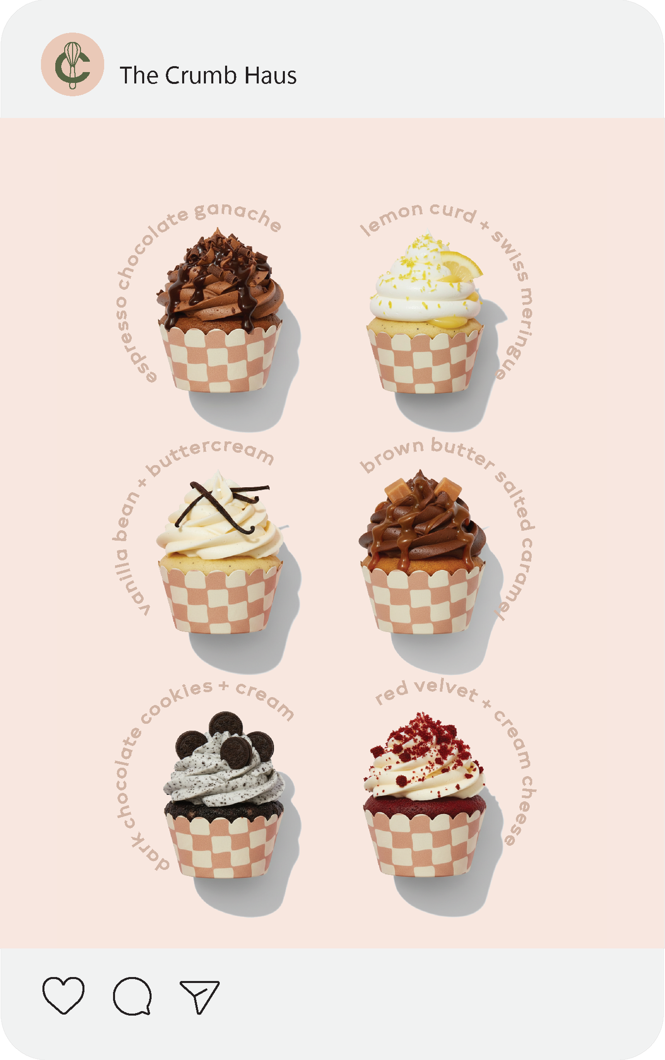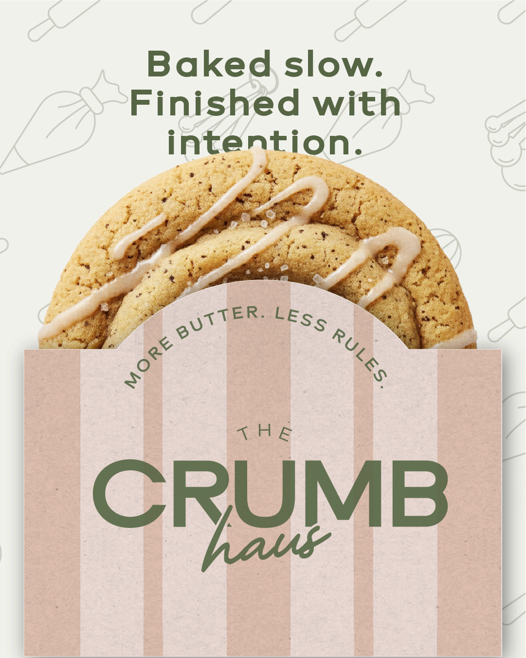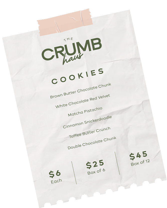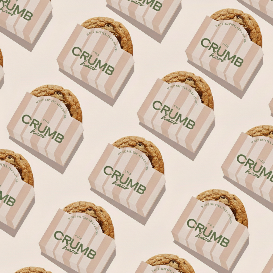 Designed to feel inviting without being juvenile, The Crumb Haus embraces a modern “haus” sensibility—where classic baked goods meet elevated branding. The visual system focuses on approachability, repetition, and tactile details, creating a cohesive identity that translates seamlessly across packaging, patterns, icons, and social content.
